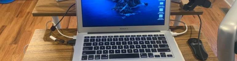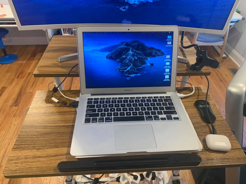 I quickly found a desk that was perfect. I stand all day. It’s light and slim profile so even when I’m not using it, it can be put in the family room and kind of blend right in. It can adjust from sitting to standing to hybrid and it’s awesome. For $75 on Amazon.