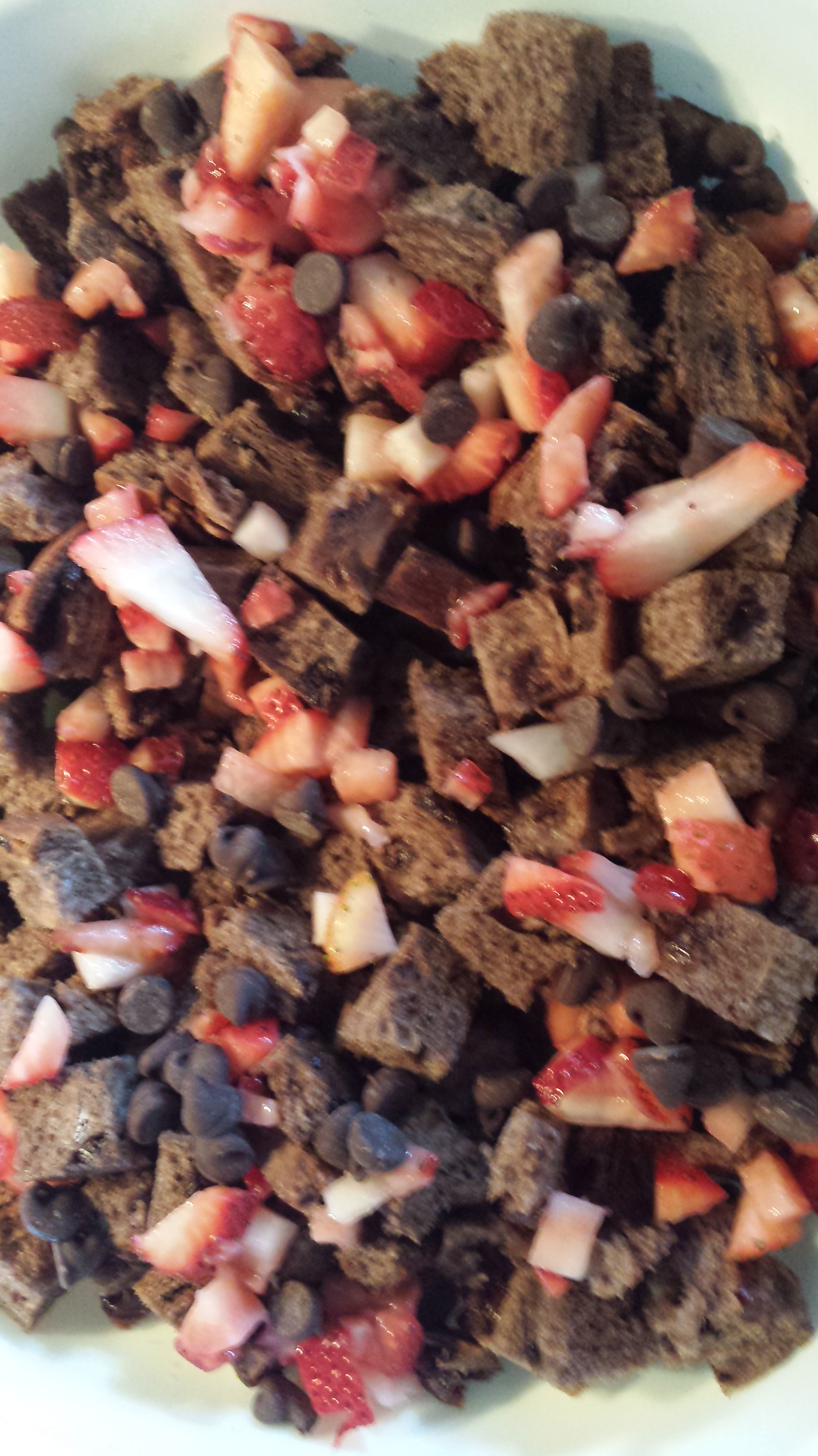 6. Grease a baking dish (9×12) to start. Put in the bread. Go one layer. Then add diced strawberries and chocolate chips. Then slowly pour your base over the bread (about half used), making sure you spread evenly. Add another layer of bread, and repeat. Once done, let this stuff sit and soak for about 40 minutes (stirring gently at 20 and then again, gently, at 40.) At this point, you’re ready to bake. If you want to take this mixture and spoon it into muffin tins, go nuts. Spoon like nobody’s watching.