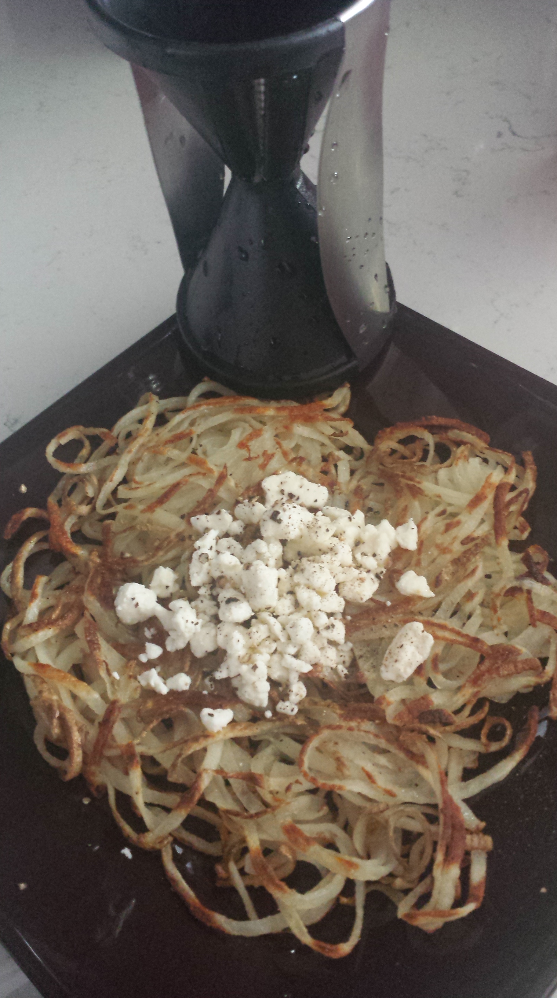 I woke up this morning feeling a little better but still worthless. Priya was scrambling to get ready for a family event and I could do so little to help. Except try and make her breakfast. In her scramble to get through the morning she wasn’t going to eat. She wasn’t going to have time for it. I had to do what I could to help on this front. I looked at the new veggie spiral slicer I bought, saw one remaining potato, was inspired.