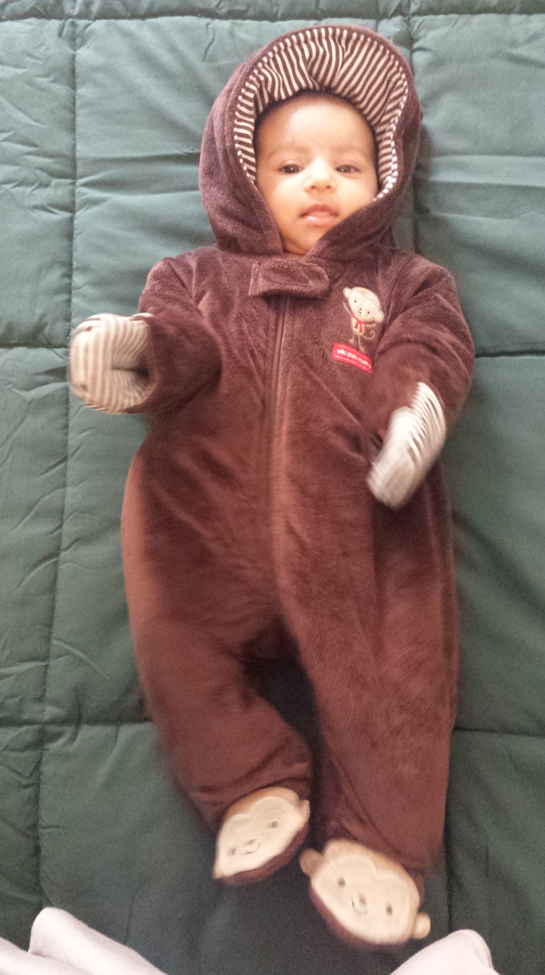 So the goal was to take you into work at this point. We were hitting the 1pm mark and that was around your sweetspot for travel, or so I was told. So after changing you and feeding you, I got you ready to go. Monkey suit on. Baby Bjorn, harnessed. It was just a matter of getting the two together. I’m going to share a picture of what you looked like before I tried to pull all of this together. Because after … well, let me cover the after, after.